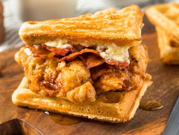 Warm waffle topped with chocolate drizzle, toasted marshmallows, and graham cracker crumbles.